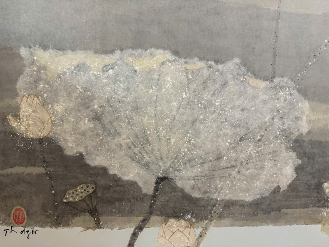 Những chiếc lá sen hiện lên đầy khí phách, từng đường gân mảnh khẽ nổi trên nền giấy loang màu, phủ một lớp bột điệp lấp lánh. Lá sen như tấm gương phản chiếu sự bền bỉ trước thời gian. Họa sĩ sử dụng bảng màu đơn sắc, đen, trắng, xám, mang đến nỗi nhớ mùa đông Hà Nội. Một bông sen trắng như sương gợi cảm giác mong manh và tàn phai, nhưng chứa đựng một sức gợi khôn cùng. Tôi nhìn thấy trong đó nỗi cô đơn, lặng lẽ của những ngày mưa bão làm tan tác cả đầm sen.
